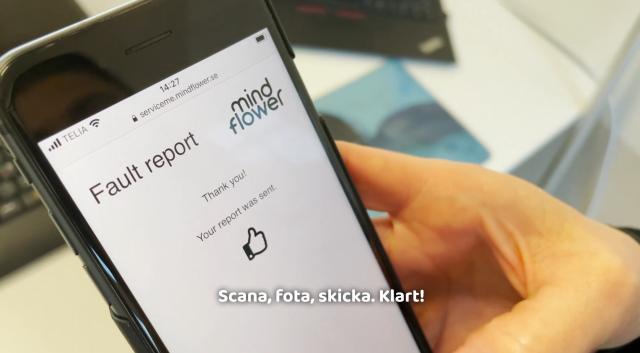 Service-Me för arbetsplatser: Du kan märka arbetsplatser eller mötesrum med en QR-kod och felrapportera utrustning genom att scanna koden i Service-Me-appen, ladda upp en en bild av utrustningen som inte fungerar och beskriva felet. Felrapporten skickas direkt till den person som kan lösa problemet.