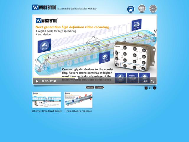 Vi tog fram ett animationsbaserat showcase med fjorton olika produkter. Showcaset innehåller animerade sekvenser med 3D-modelerade tåg och tågspecifika miljöer som tydligt visar applikationer, problemuppkomst och hur problemen kan elimineras med Westermos produkter. Produkterna finns även med som roterbara modeller med faktaspecifikationer. Vi valde att göra showcaset plattformsoberoende för största möjliga användbarhet bland Westermos många kanaler och återförsäljare världen över.
